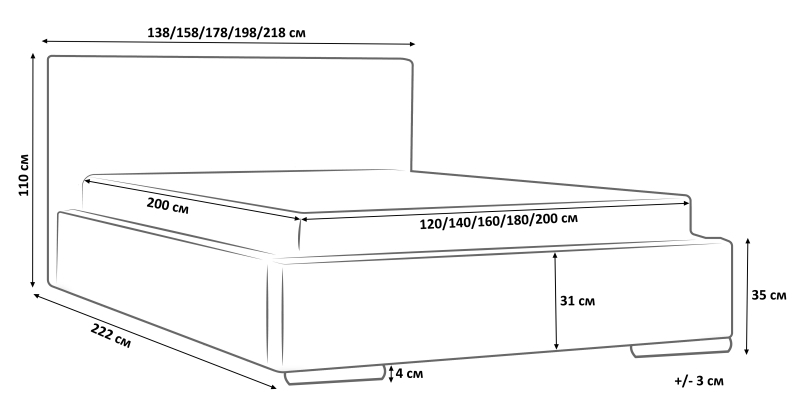 - 218/110/222 см, площ за спане: 200 х 200 см.